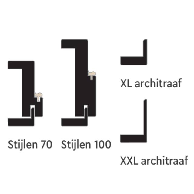 Met de standaard (los meegeleverde) architraaf kun je bovendien een speling van 10 mm in muurdikte overbruggen. Heb je een dikkere muur? Dan kun je eenvoudig een XL of XXL architraaf los bijbestellen om het kozijn passend te maken. (Vraag een offerte op maat aan)