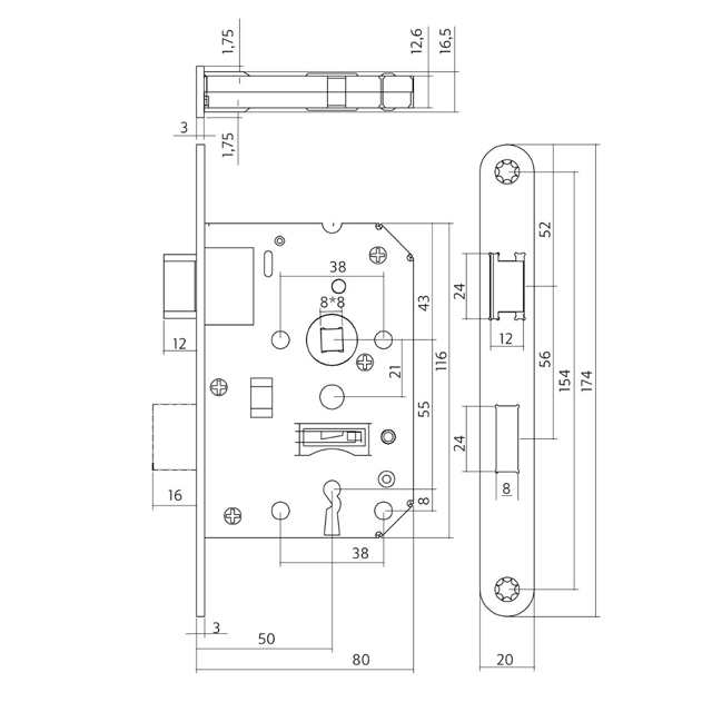 + Gesloten slotkast 117 x 80 x 13 mm