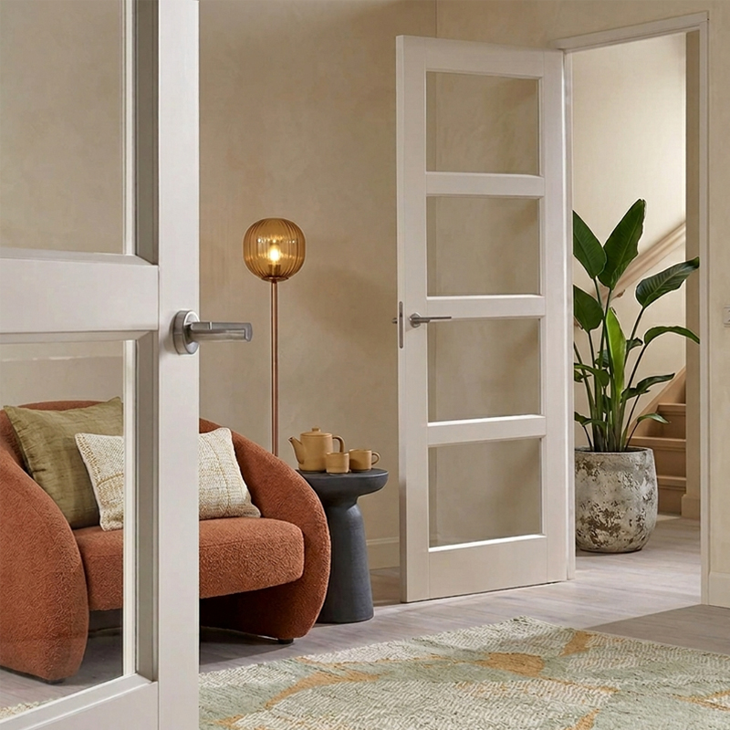 Zoek je een binnendeur die rust uitstraalt en een statement maakt? De Austria Jersey uit de populaire Balance-serie is een absolute klassieker. Deze binnendeur met glas brengt direct extra licht en een ruimtelijk gevoel in huis, zonder in te leveren op een warme, traditionele sfeer. Dankzij de verfijnde facetprofielen langs de deurstijlen en de schuin afgewerkte rand rondom de bossingpanelen is de Austria Jersey Blank Facetglas het schoolvoorbeeld van een tijdloze binnendeur.