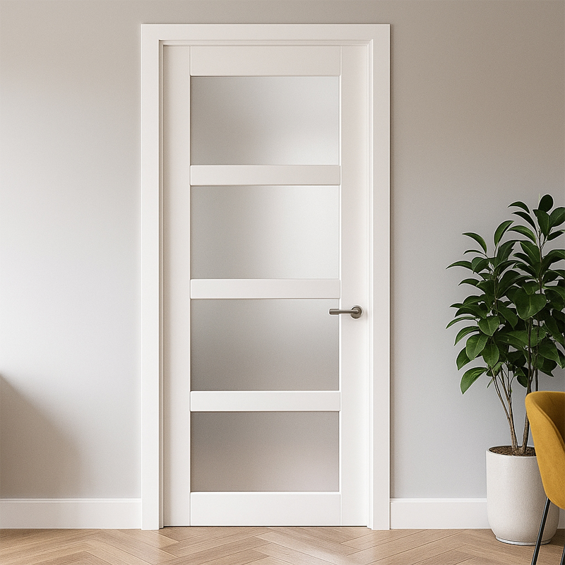 De CanDo PNL1 2B04 Satijn glas binnendeur is voorzien van facetprofielen aan de deurstijlen en rondom de facetpanelen in de deur. Dit staat garant voor een tijdloze uitstraling wat kenmerkend is voor alle deuren uit de CanDo Panel Classic collectie. Binnendeuren uit deze collectie zijn perfect te combineren met elkaar en passen bij elk interieur. Deze sterke MDF-deuren zijn rondom voorbehandeld met een witte grondverf. Licht opschuren, ontvetten en tweemaal aflakken is het advies voor het mooiste eindresultaat. De stijlbreedtes zijn 115 mm inclusief het profiel. Bij deuren van 231.5 zijn de stijlen 130 mm breed inclusief het profiel.