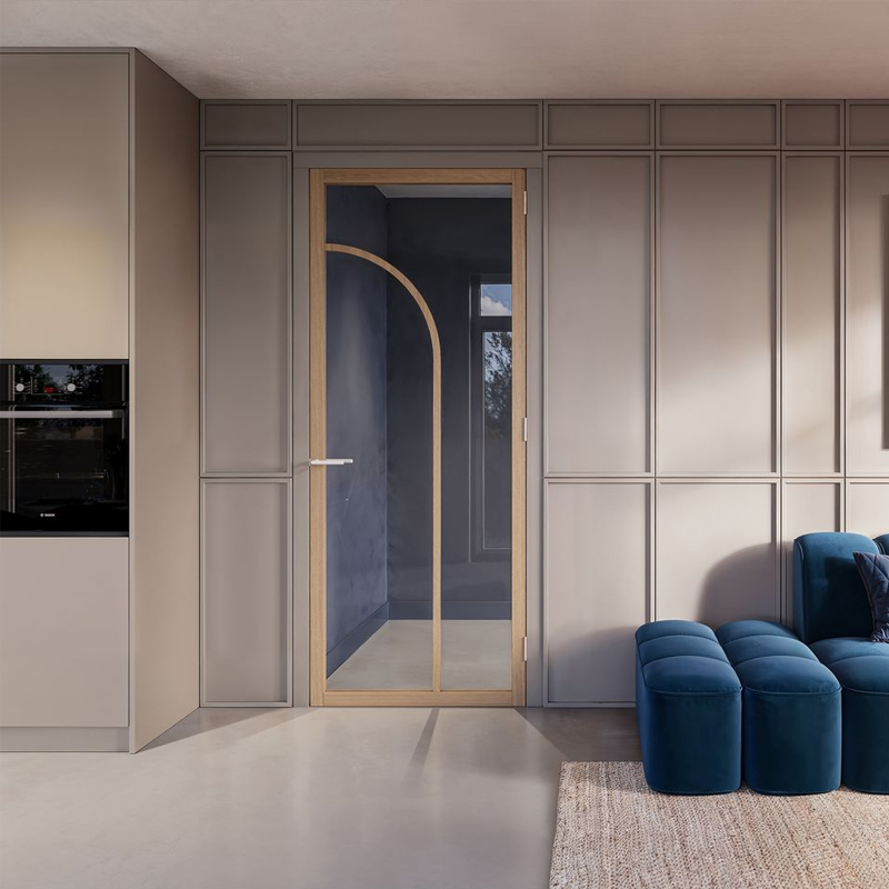 Deze deuren zijn 39 mm dik en worden geleverd met gemonteerd 8 mm veiligheidsglas. De haakse profielen zorgen er voor dat er geen glaslatten nodig zijn en de deur een minimalistische uitstraling krijgt.